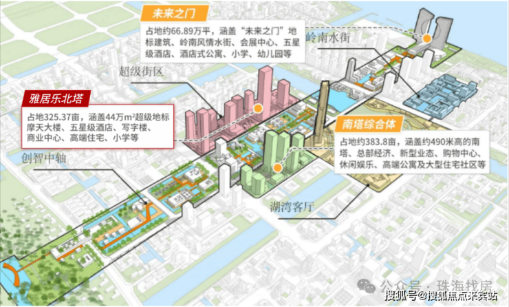 南部 : 400万㎡连片大型综合体以及高端科研企业为主,涵盖:居住、商业、娱乐、产业、科技、教育、医疗等于一体,补足北部及中部的缺失
