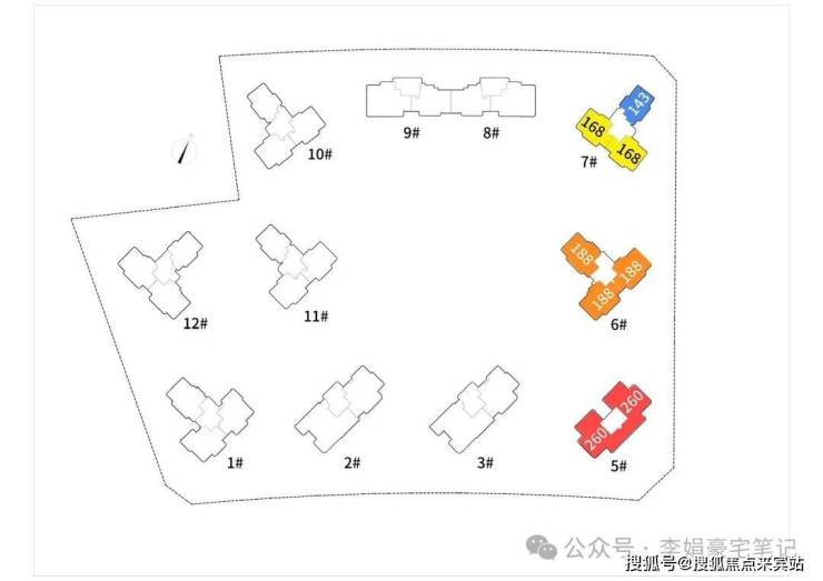 12栋住宅,层高受限高80米影响,预计在20–22层之间,板塔结合,采用点式错位布局以最大化视野。