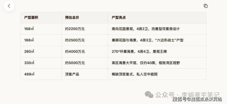 整体定位:纯大户型社区,新规设计,得房率/使用率近100%。户型区间:建面约 140–500㎡ 大平层及顶层复式。