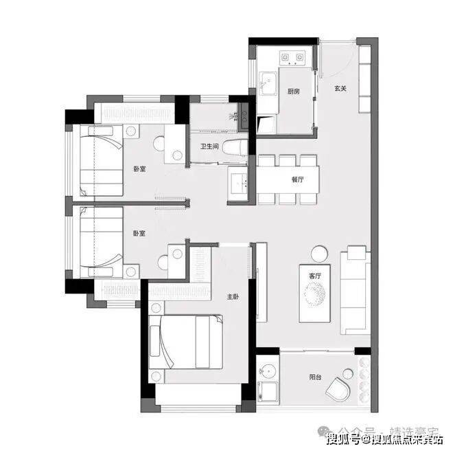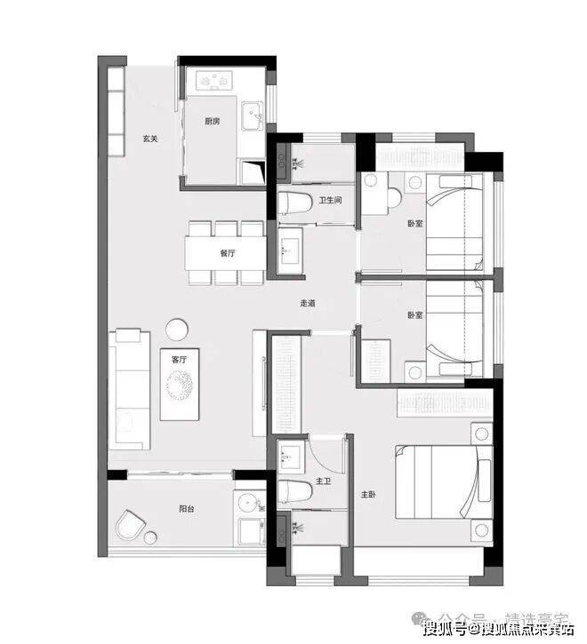 户型方正通透,全南向布局;客餐厅一体化;卧室全飘窗,雅致通透;贴心工卫设计、干湿分离。