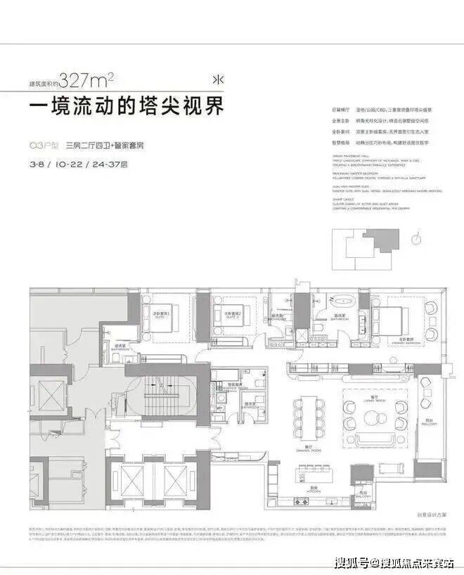 公寓面积段覆盖300-1000㎡(具体包括300㎡、400㎡、460㎡、570㎡、1000㎡等大平层),起步户型预计200㎡以上,主打“总裁级大平层”,满足高净值人群对空间尺度与私密性的需求。