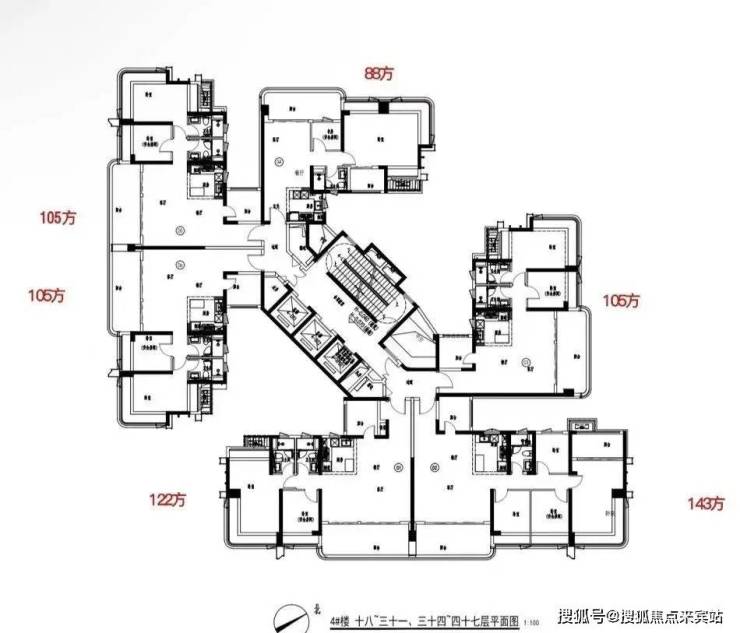 6个户型,朝向分别为:88平朝西北,2个105平朝西南,122平和143平朝东南,还有一个105平朝东北,不分户型大小,全都是3.05米层高