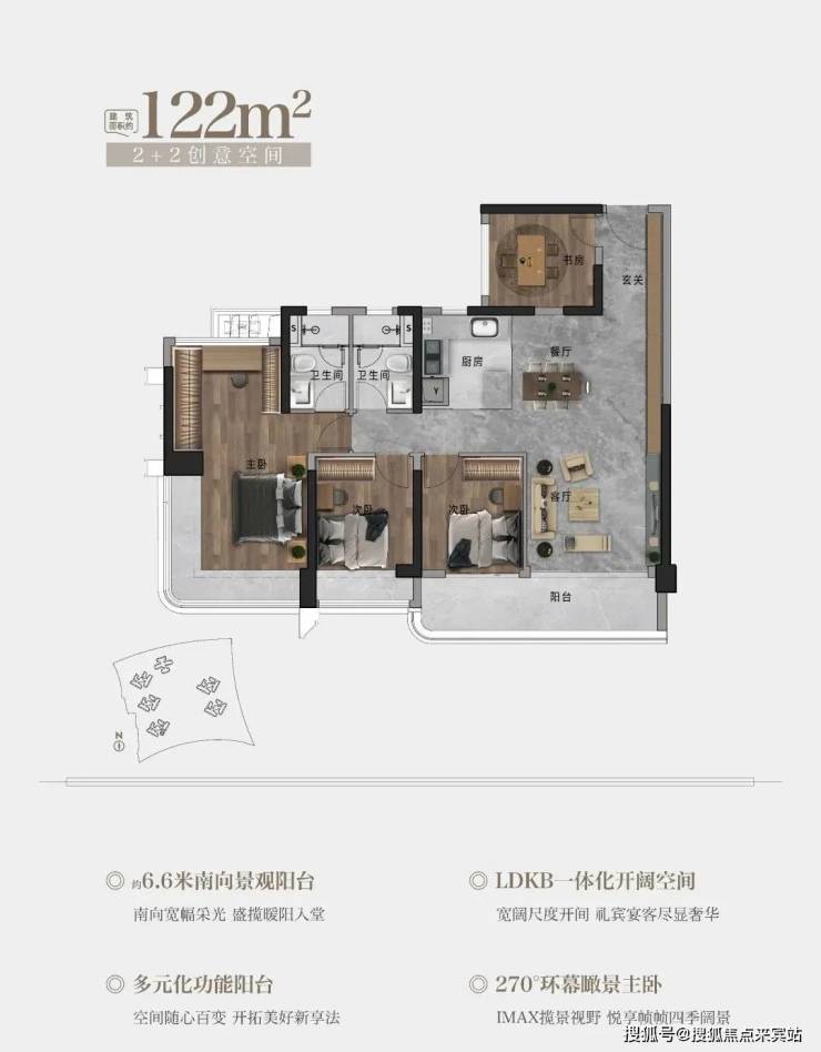 122㎡户型,约6.6M南向景观阳台 | 270°环幕瞰景主卧|多元化功能阳台