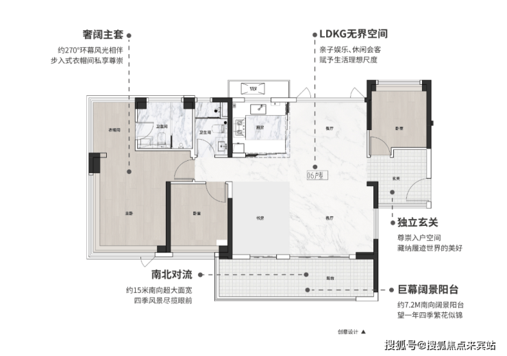 餐客厅一体化设计,连通约7.2米南向阔景阳台,亲友聚会无压力;主卧带步入式衣帽间,私密性更佳。