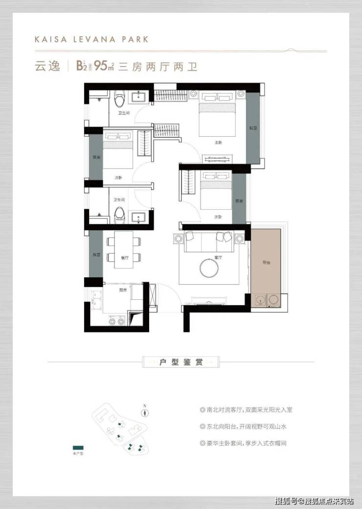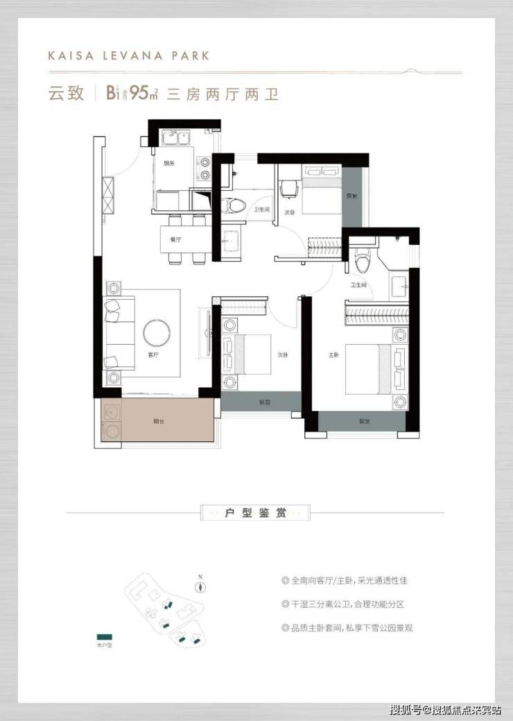 主力户型约95㎡三房:创新竖厅格局,双卫设计,空间布局合理,满足多口之家需求