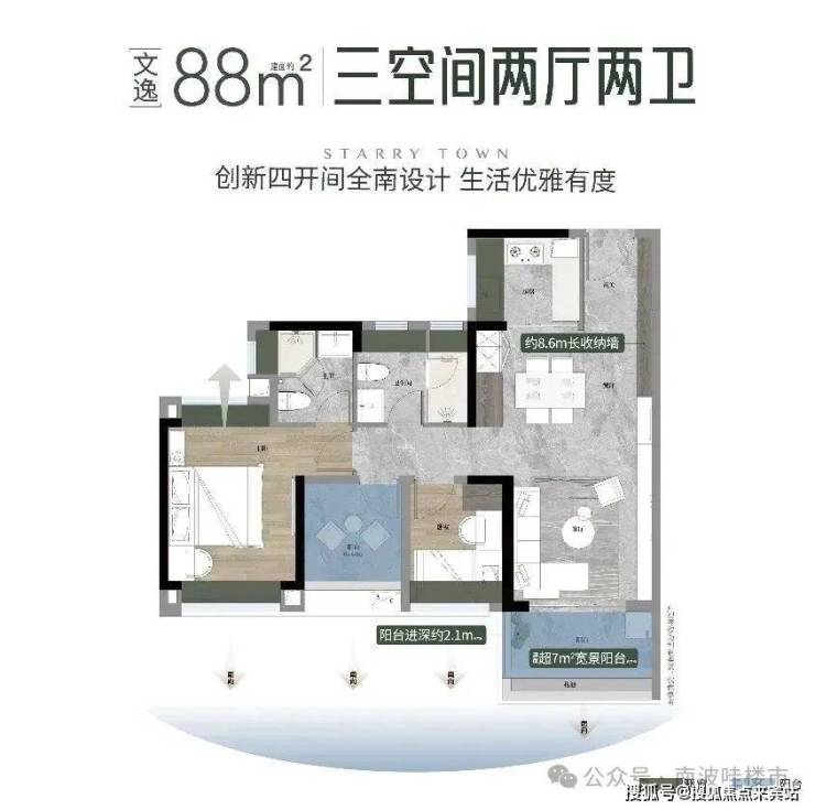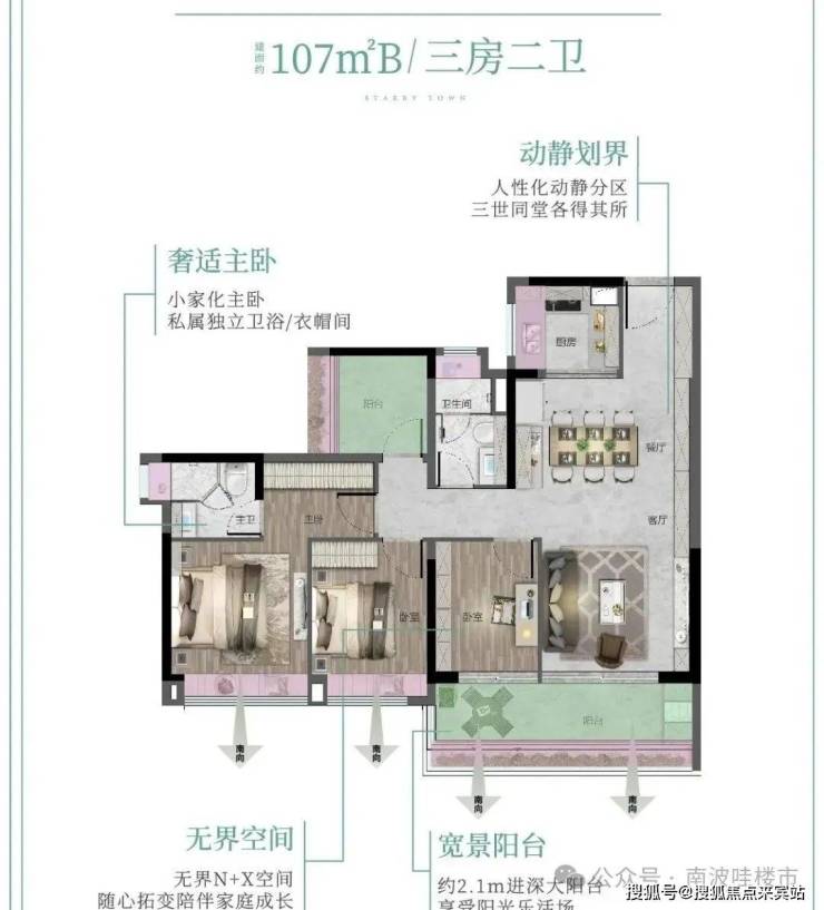 107㎡A 4空间2厅2卫,4.5 开间朝南,客厅主卧双南北对流,5.9米长观景阳台!交互式方厅,可开可合