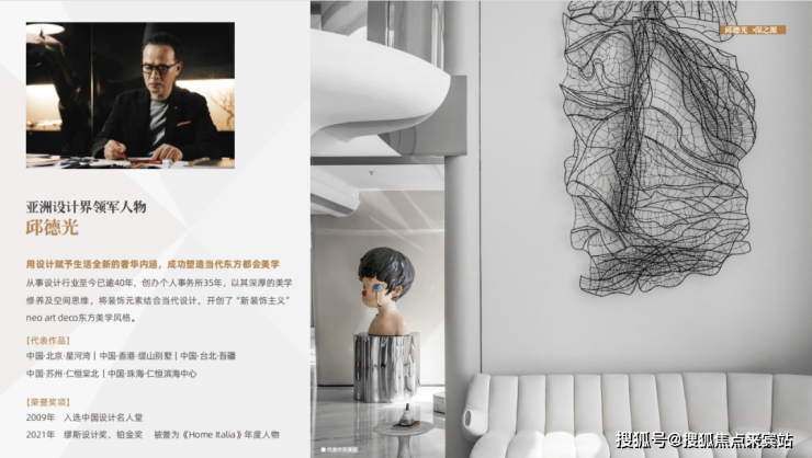 亚洲设计界领军人物邱德光,从事设计行业至今已逾40年,以其深厚的美学修养及空间思维,将装饰元素结合当代设计,开创了“新装饰主义”neo art deco东方美学风格,曾执笔北京星河湾、香港缇山别墅、台北吾疆等豪宅项目的设计。