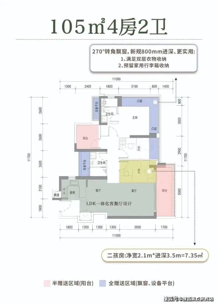 如此,这个户型就变成4房2卫户型,标准的2卫。他的主卧还是270度的转角飘窗,且没有柱子,其中一面可以做大衣柜。缺点是,3个次卧还是要定制床的,毕竟,这还是只有105平的户型,奢侈不起来。