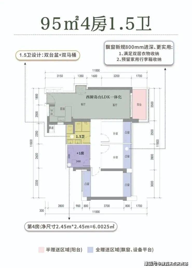 于是,一个95平4房1.5卫户型就诞生,,尽管3个次卧都要睡飘窗,但毕竟房产证只有95平,总价低,还是很牛的。这个户型只有1条腿,比较稀缺。