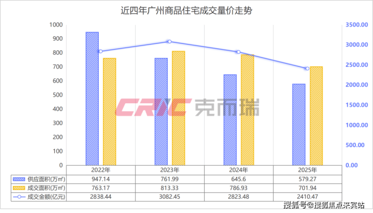 广州方面,克而瑞数据监测显示,2025年广州商品住宅供应面积579.27万㎡,同比减少10%,成交面积701.94万㎡,同比减少11%,成交金额2410.47亿元,同比减少15%。