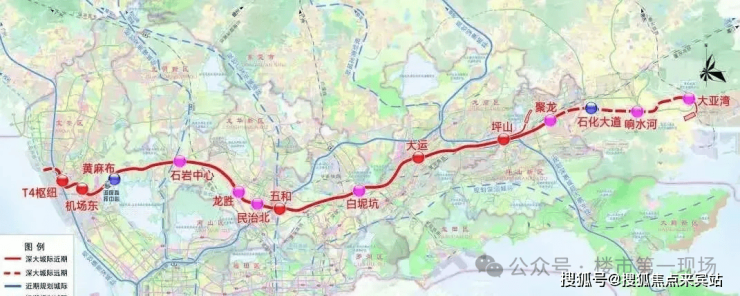 全线设地下站11座,分别为T4枢纽、机场东、黄麻布、石岩中心、龙胜、民治北、五和、白坭坑、大运、坪山、聚龙,预计 2026 年建成后,坪山至深圳机场最快仅需 40 分钟