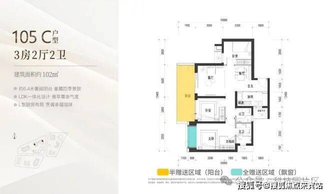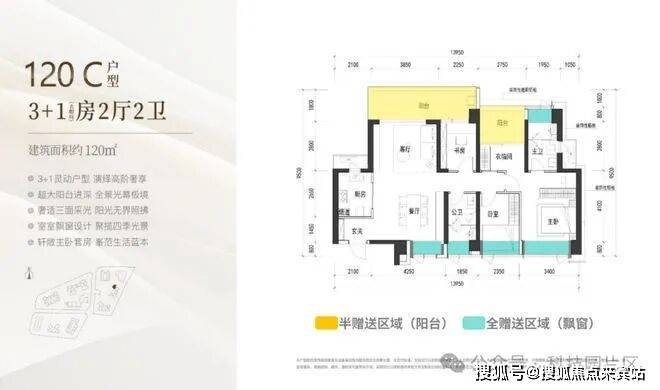 C户型(1栋1/2单元02户型):竖厅格局,客厅3.6米开间,LDK一体化设计,三个卧室分别约16.93㎡、9.24㎡、8.96㎡(含飘窗),6.4米宽景大阳台,得房率约90%,西南或东北朝向。