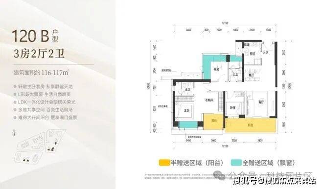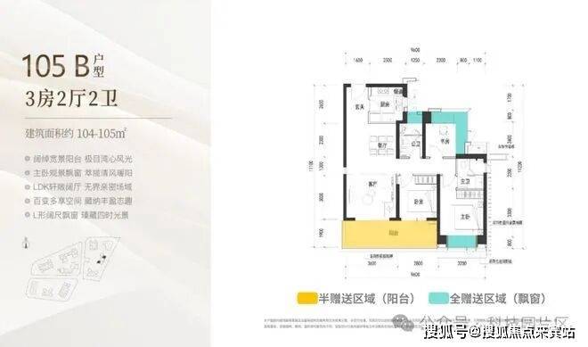 B户型(2栋3单元02/06户型):经典竖厅格局,客厅3.6米开间,LDKB一体化设计,三开间朝南,动静分区,三个卧室分别约13.12㎡、9.9㎡、8.4㎡(含飘窗),6.4米宽景大阳台,得房率约90%,正南或东南朝向。