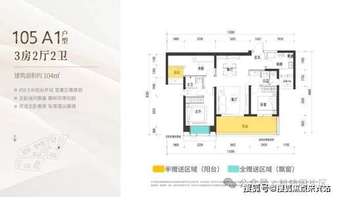 A1户型(2栋3单元03户型):竖厅类双龙抱珠格局,客厅3.6米开间,客餐厅一体化设计,三个卧室分别约12.8㎡、12㎡、8.7㎡(含飘窗),6.5米宽景大阳台,U型厨房,公卫三段式分离,得房率约90%,东南朝向。
