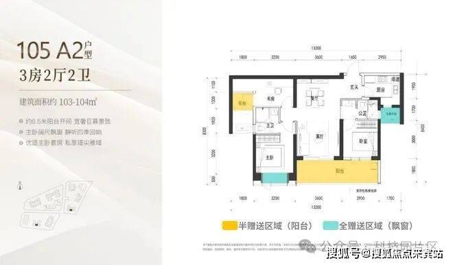 A2户型(2栋4单元03户型):竖厅类双龙抱珠格局,客厅3.6米开间,三个卧室分别约12.8㎡、12㎡、8.7㎡(含飘窗),6.5米宽景大阳台,U型厨房,得房率约90%,正南朝向。