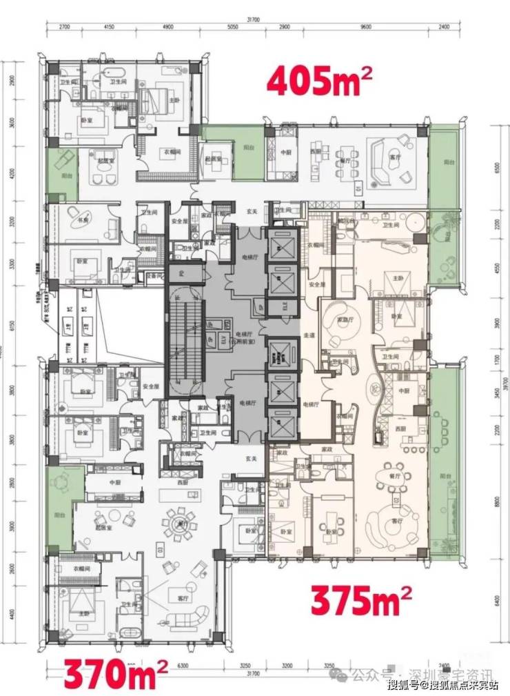 · 高区42F-52F:(150-187米)约370-375-403㎡,4+1房五卫+家庭厅+家政套间;
