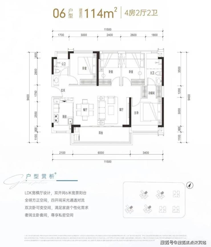 建面约114㎡是传统短进深大开间横厅格局,通透性很好,客厅进深6米,开间4.3米(不含阳台),配有6米宽景阳台,主卧套间设计,配衣帽间和三段式卫生间,这个户型很比较讨喜年轻的购房群体。