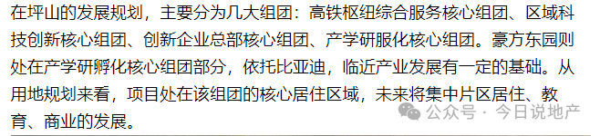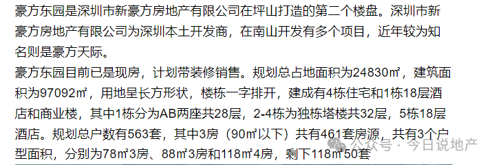 豪方东园位于坪山新区坪山比亚迪路以北、沙新路以东,总占地面积约2.46万㎡,建筑面积约11万㎡。业态上由4栋高层住宅、1栋星级酒店以及沿街商业组成。在规划设计方面,整个项目实现了商住分区,酒店和4栋住宅可以实行分区管理,酒店与住宅小区互不干扰的同时,在它们之间设计了一条商业内街,给社区提供了更多的公共休闲空间。