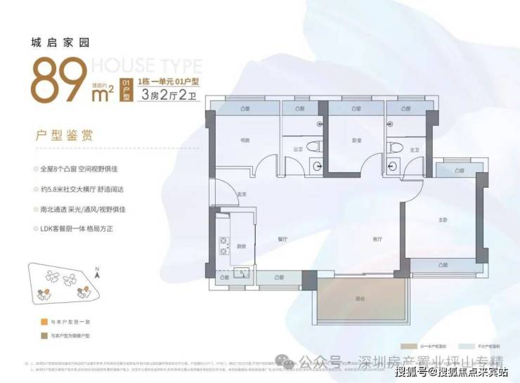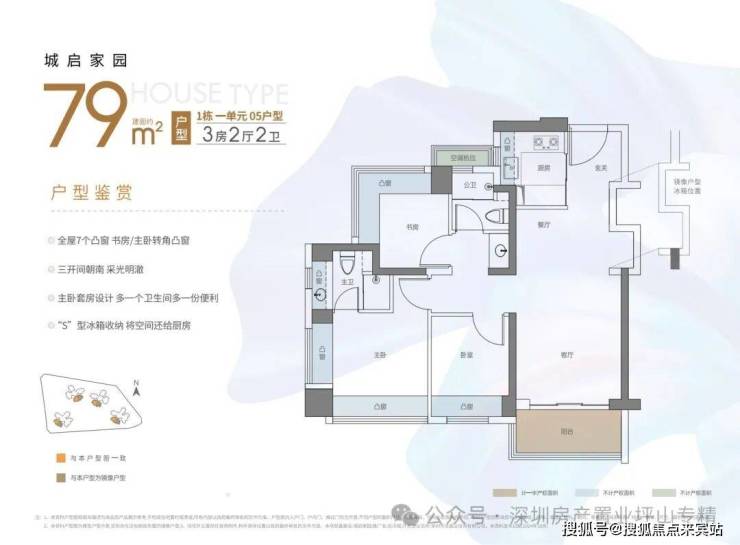 设计的是经典竖厅格局,LDKB一体化,S墙设计预留冰箱卡槽位,动静分区,三开间朝南,主卧+1个次卧270°飘窗设计,U型厨房,公卫三段式分离,东南或西南朝向。