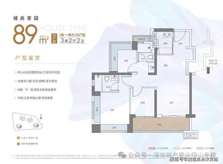 02.03户型,设计的是经典竖厅格局,LDKB一体化,S墙设计预留冰箱卡槽位,动静分区,三开间朝南,主卧+1个次卧270°飘窗设计,U型厨房,公卫三段式分离,客厅连接卧室出5.45米长的大阳台,东南朝向。