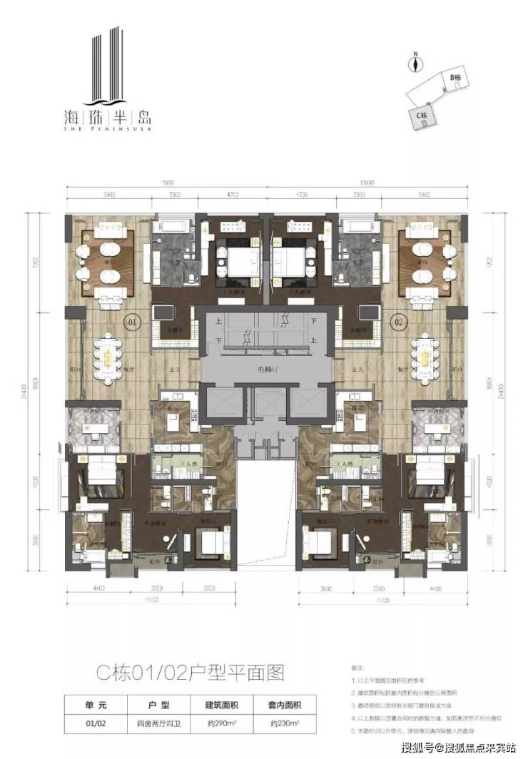 整个海珠半岛占地面积约6755㎡,建筑面积约63746㎡,小区整体规划为B、C两栋43层的超高层江景豪宅,住宅首层为10米挑高的大堂,2F为小区会所配套,3-43F为可售的住宅部分,户型涵盖290㎡和315㎡的大平层江景四房。