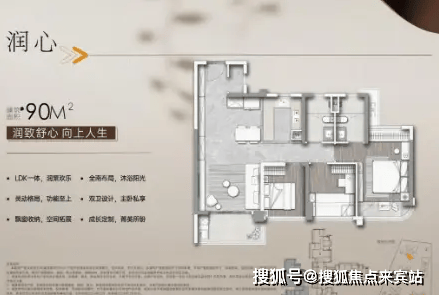 90㎡三房两厅两卫户型,总价约485-525万,部分特价房源420万起,双卫设计更适配三口之家,动静分区合理,客厅连接阳台,通风效果好;