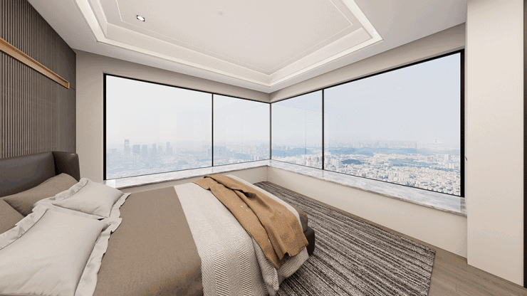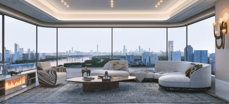 高区房型更能实现南向望江,主卧与客厅均享有270°环幕视野,无柱化设计和弧形玻璃转角,最大化拓展了观景视野,山、江、园景轻松纳入室内