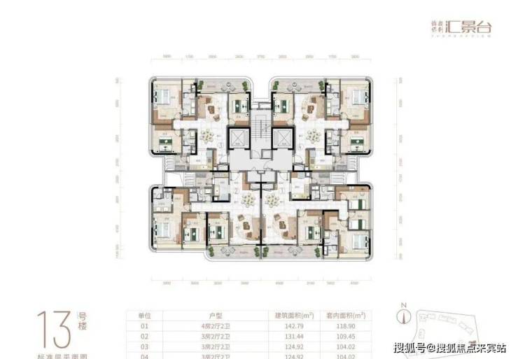 项目由14栋12层小高层组成,产品涵盖123-352㎡三至五房,共8类户型,户型实用率约82-84%