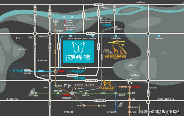 围绕际华园湖蝶湾的还有约3万㎡的水晶湖、约2万㎡星级酒店、约5000㎡文娱中心、国际5A双塔办公楼、5C汽车生态公园、新兴际华医疗康养中心、清远长隆国际森林度假区等等。