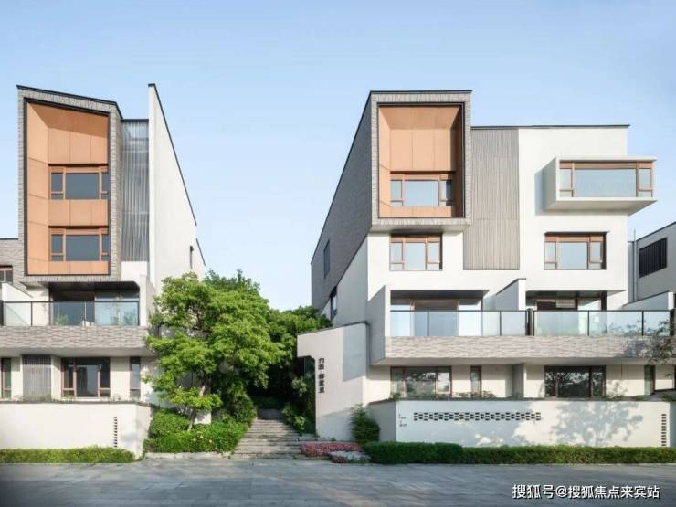 建筑外立面设计融汇古典与现代风格,采用现代构成手法,局部融入穿斗墙、斜屋顶、满洲窗等元素进行点缀,暖灰色外墙砖与米白色的质感涂料搭配,利用铝合金线条勾勒建筑的天际线,富有滴水功能的金属窗套,注重比例与细节,使得建筑的层次感与品质感得到更进一步呈现。