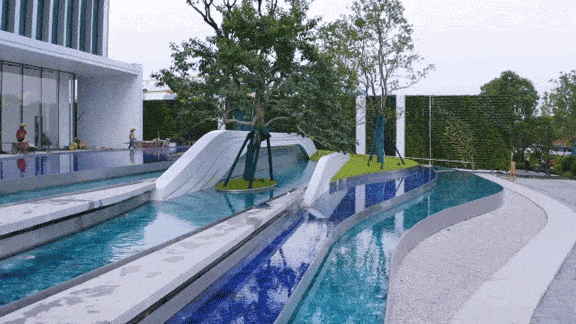 营销中心外广场以层层叠浪为灵感,借助艺术的涌动与翻滚的语言特质,凭借浪花的意象,切入“水”的主题,从海浪场景中抽取“水滴和浪花”的概念,形成“海中有景,岸上有浪”的场域特质,实现了“人-海-景-建筑-城市”相融的滨海活动空间。