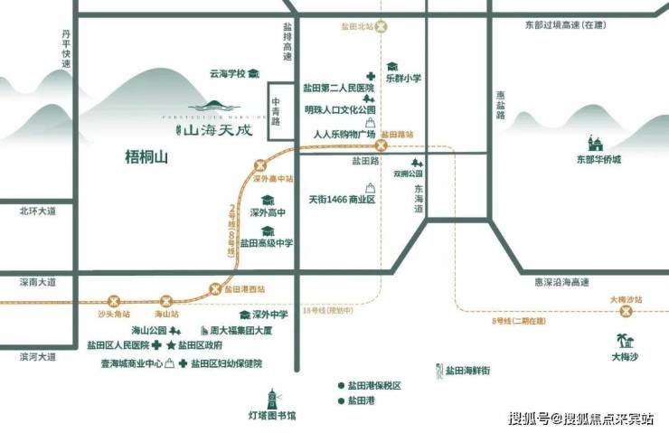 山海天成,位于盐田区盐田港中青路中海半山溪谷西侧,梧桐山半山腰上,项目所在的板块属于盐田港全新开发的区域,该片区的楼盘基本上都是在2015年之后开发的,整体面貌较新,都是高档小区,附近有2/8号地铁线“深外高中地铁站”。