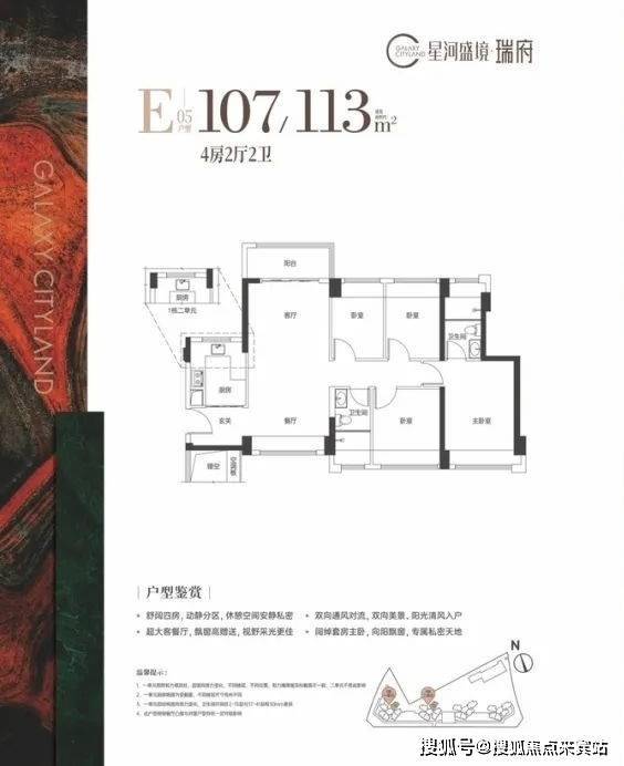户型面积布局E05107-113平四房两厅两卫设计的是竖厅南北通透格局,进门入户玄关,LDB一体化设计,全屋8面飘窗,四开间朝南,U型厨房,卫生间干湿分离,得房率约76-81%(不含赠送),阳台主朝西北向。