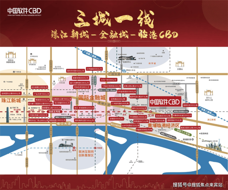 中国软件 CBD 总部位于“珠江新城-金融城-临港 CBD”城市发展轴,临港 CBD 与金融城规划为“广州第二 CBD”,向外辐射琶洲商圈,广州科学城,体量是珠江新城的 10 倍。