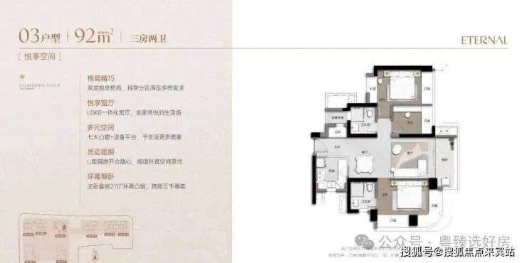 92m²的3房2厅2卫,设计的是双龙抱珠格局,客厅3.2米开间,LDKB一体化宽厅,主卧套房270°环幕凸窗,七大凸窗+设备平台,U型厨房,卫生间干湿分离,得房率超90%(包含赠送),阳台实测6.54㎡正东朝向。