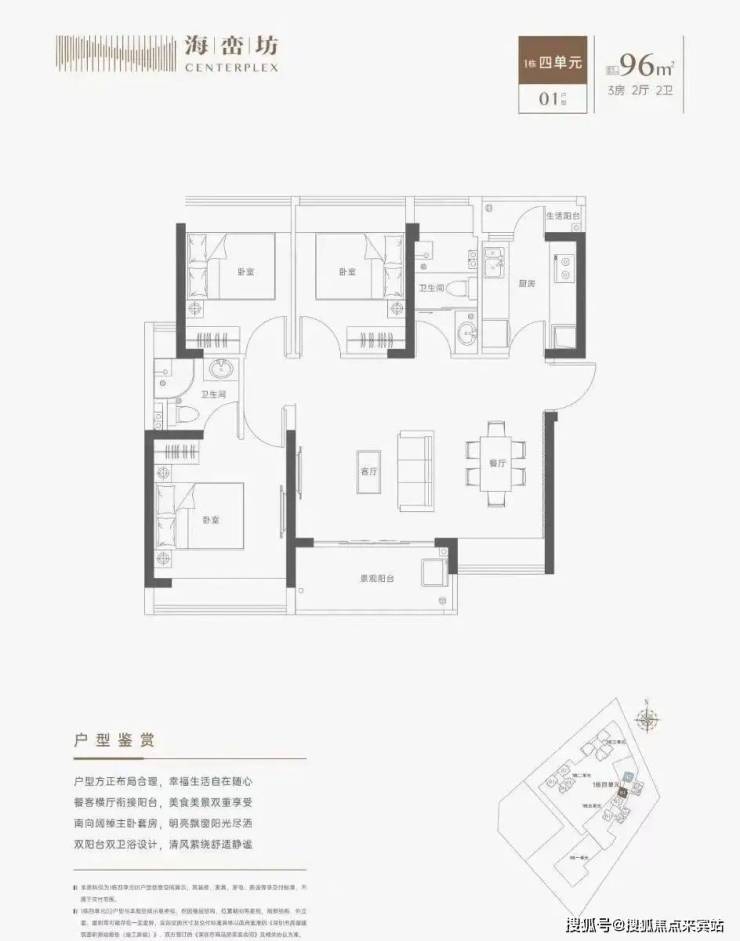 96㎡的3房2厅2卫,设计的是横厅南北通透格局,进门独立玄关,全屋飘窗,三开间朝南,U型厨房,得房率:71.15%(不含赠送),阳台主朝东南向。