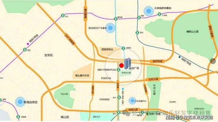 位于深圳市科技园科苑路,深圳市高新技术产业中轴线上,南联华润大厦(春笋)及后海金融总部区域,与深圳湾跨境口岸相连。北接西丽留仙洞科技产业基地、大学城科技创新基地