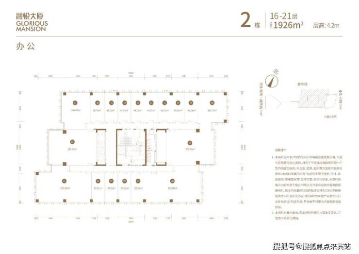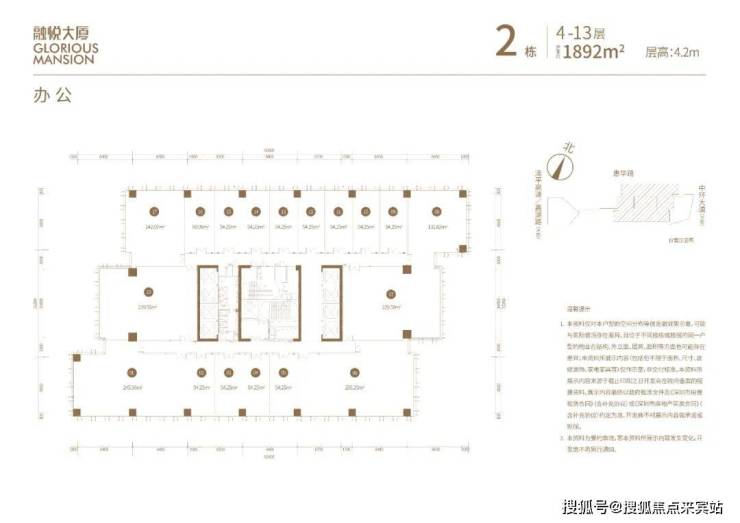 塔楼:共23层(3至23层为办公,共372户 ),办公面积39604.21㎡,标准层面积1837㎡,四面采光,主力户型54-62㎡,次主力户型90-146㎡以及200-300㎡,层高4.2m,荷载200kg/㎡,实用率约75%,毛坯交付。