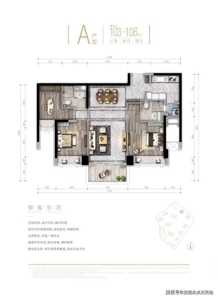 建面约103-106平三房两厅两卫;