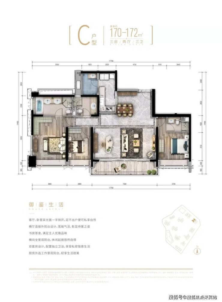 建面约170-172平三房两厅两卫;