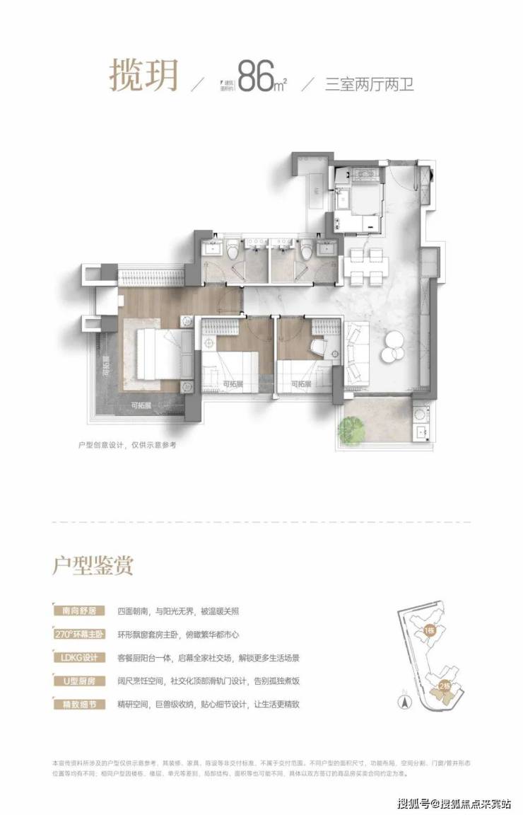 户型上与86方大差不差,每个区域空间感更强,阳台也更大,在北边也多了个暗房次卧。