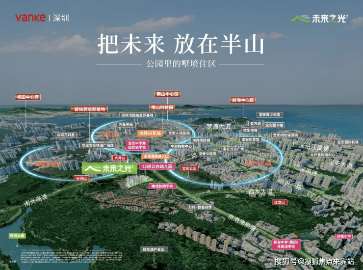 宝安-万科未来之光,地处宝安尖岗山,被定位为“新兴产业集聚带”,正积极引入数字经济、智能制造、新一代信息技术等高端产业。近邻南山科技园、留仙洞总部基地、宝安中心、前海自贸区等片区,集合向西发展带优质城市资源,是各高端科技产业直接辐射的腹地。