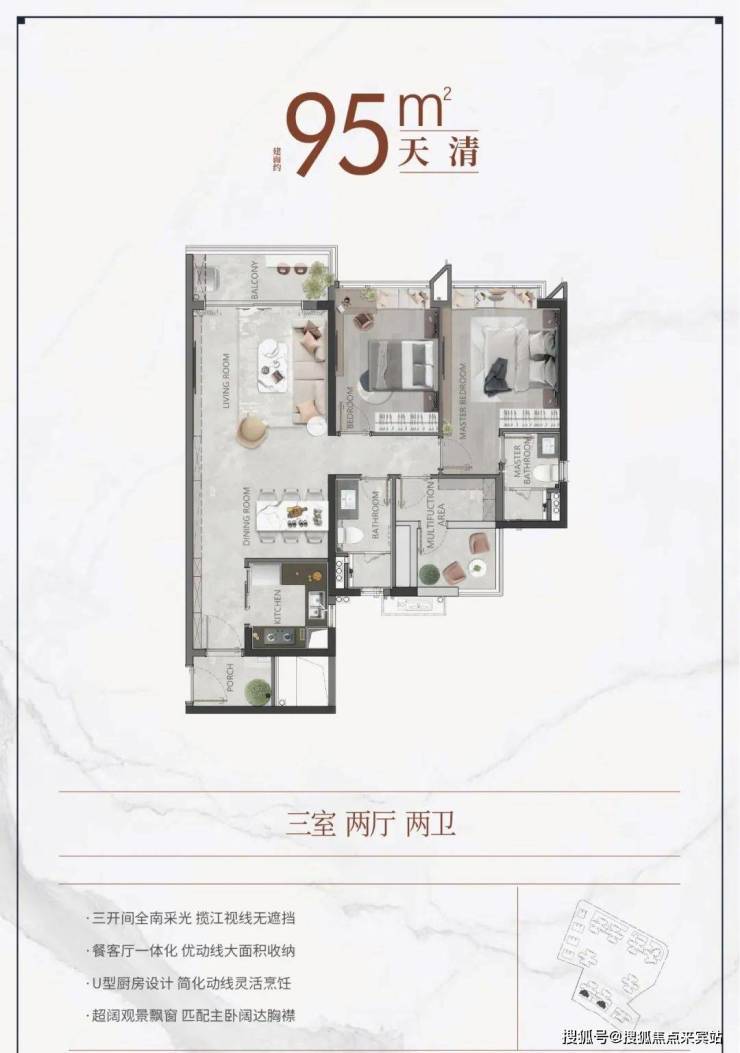 项目目前在售的组团共有9栋楼,其中工抵房源主要位于1-2-3栋。这三栋楼为毛坯交付,95平户型朝向西南,正对越秀天悦江湾方向。项目面积段涵盖95-110-131平,提供三至四房户型。
