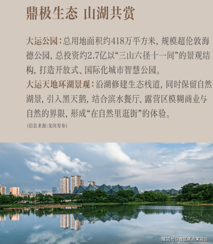 坐享大运公园(约418万㎡)、龙城公园(约189万㎡),环境优美,绿化率超50%,绿化率是福田中心的5倍、前海中心的4倍,是深圳首个“国家级生态示范区”。