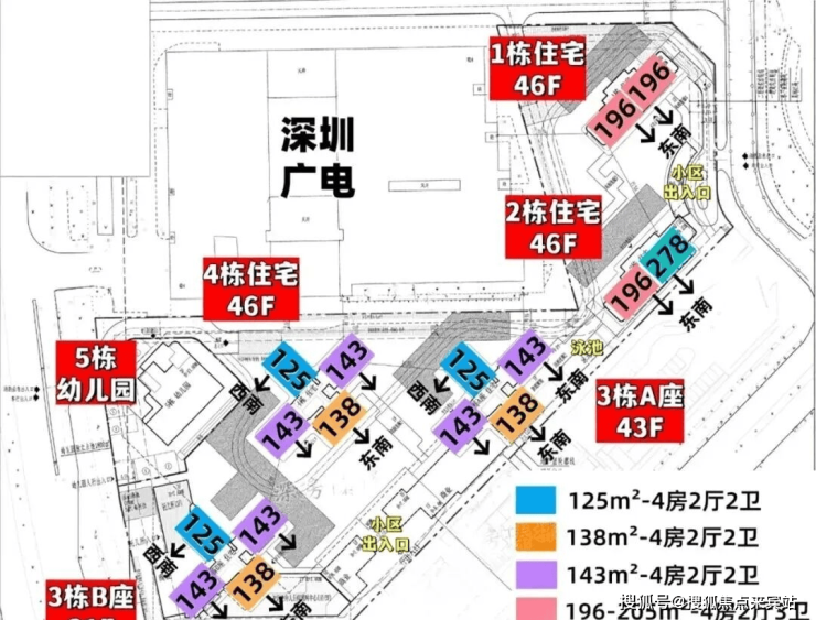 根据最新披露的总平图,大运玖章花园规划建设五栋高层及超高层住宅。分别为1-4栋,3栋又分为A、B两座。整个项目由于被分为两个不规则的小地块。基于地块形状,大运玖章花园将1栋、2栋分布在较小的北地块,并且都是46层的超高层,户数则是一层两户。