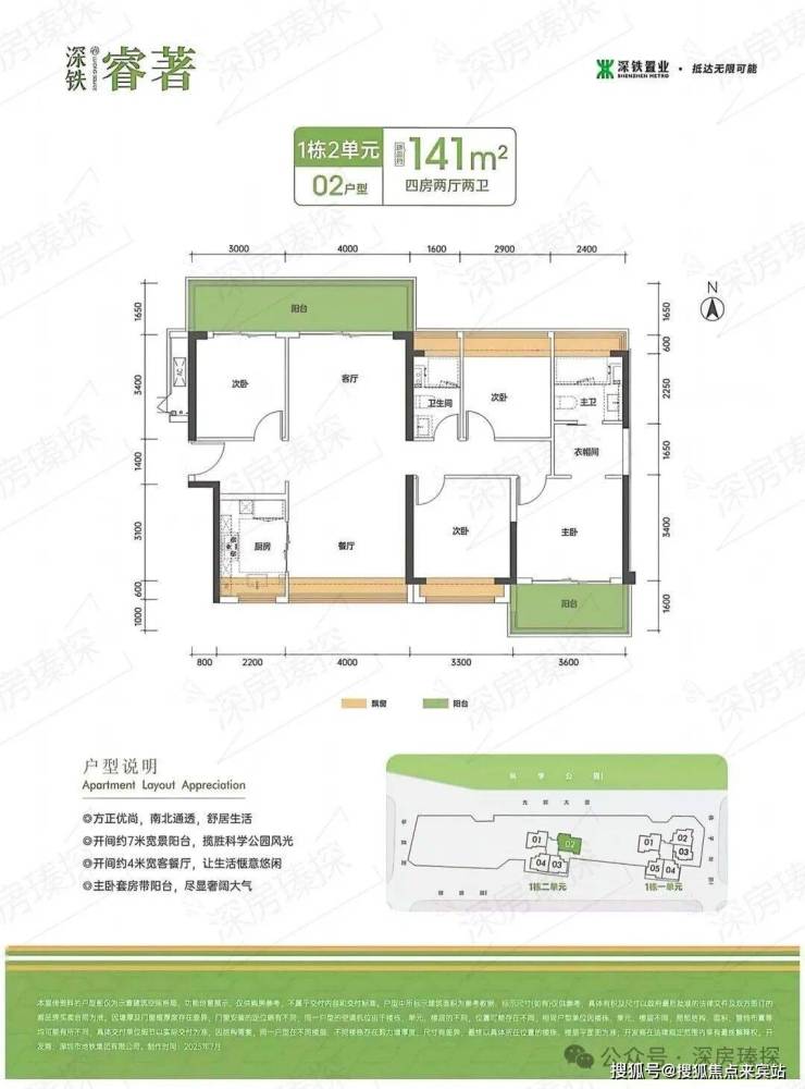 141㎡的4房2厅2卫,1栋2单元02户型,设计的是竖厅南北通透格局,进门入户玄关,客厅4米开间,实测高达31.58㎡方正餐客分离,餐厨一体设计,四开间朝南,主卧套房带阳台,分别做到了主卧19.89㎡/次卧11.49㎡/次卧9.3㎡/次卧9.1㎡(实测面积,去掉墙体),客厅连接次卧出11.55㎡的巨幕大阳台,U型厨房,卫生间干湿分离,得房率约:79.7%(不含赠送),阳台主朝东北向看科学公园。套内面积111.72㎡+赠送面积18.5㎡=实用面积130.22㎡,加上赠送后得房率约92.9%。