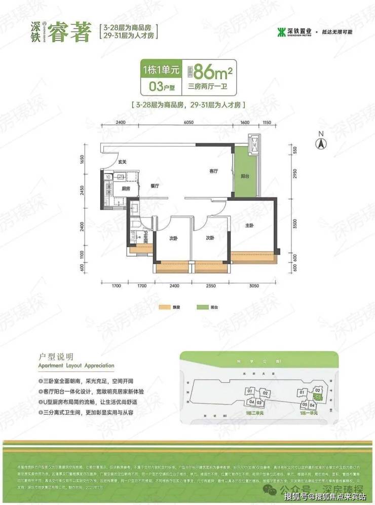 86㎡的3房2厅1卫,1栋1单元03户型,设计的是竖厅格局,客厅3.5米开间,LDKB一体化设计,进深10.05米,主卧全朝南,动静分区,分别做到了主卧11.67㎡/次卧8.64㎡/次卧8.46㎡(包含飘窗),U型厨房,卫生间三段式分离,得房率约:79.4%(不含赠送),阳台5.5㎡东南朝向。套内面积68.26㎡+赠送面积8.5㎡=实用面积76.76㎡,加上赠送后得房率约89.33%。
