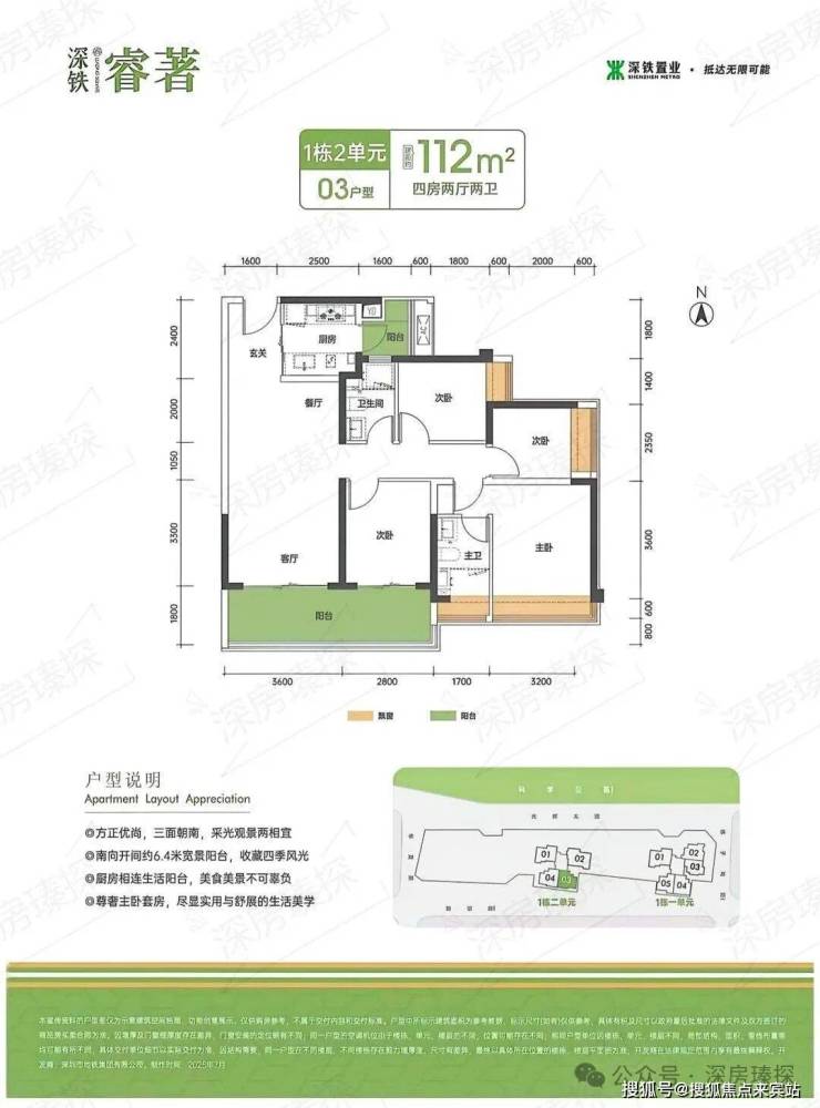 112㎡的4房2厅2卫,1栋2单元03户型,设计的是经典竖厅格局,进门入户玄关,客厅3.6米开间,餐客分离,餐厨一体设计,四开间朝南,主卧套房带阳台,分别做到了主卧13.68㎡/次卧7.91㎡/次卧7.1㎡/次卧6.54㎡(实测面积,去掉墙体),客厅连接次卧出11.52㎡的巨幕大阳台,U型厨房,卫生间干湿分离,得房率约:79.7%(不含赠送),阳台主朝东北向看科学公园。套内面积89.25㎡+赠送面积13.47㎡=实用面积102.72㎡,加上赠送后得房率约91.73%。
