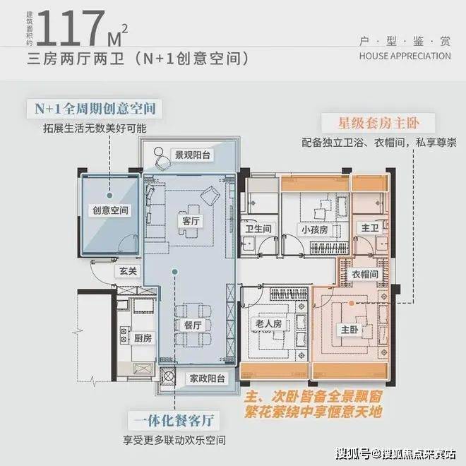 而约115-117平3+1户型,则升级为四开间朝南,南北通透双阳台的双面观景格局。