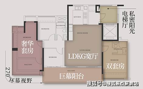 约8.4米南向巨幕阳台,主卧270°飘窗,能最大程度引园景入室。